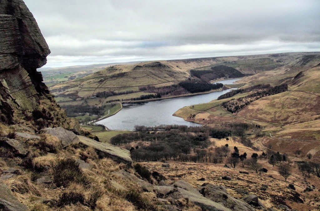 As you proceed up this more rocky section you have a really nice, clear view across to Charnel Clough with an indicator of how steep the slope is very visible. To the other side is a beautiful view across Dove Stone Reservoir.